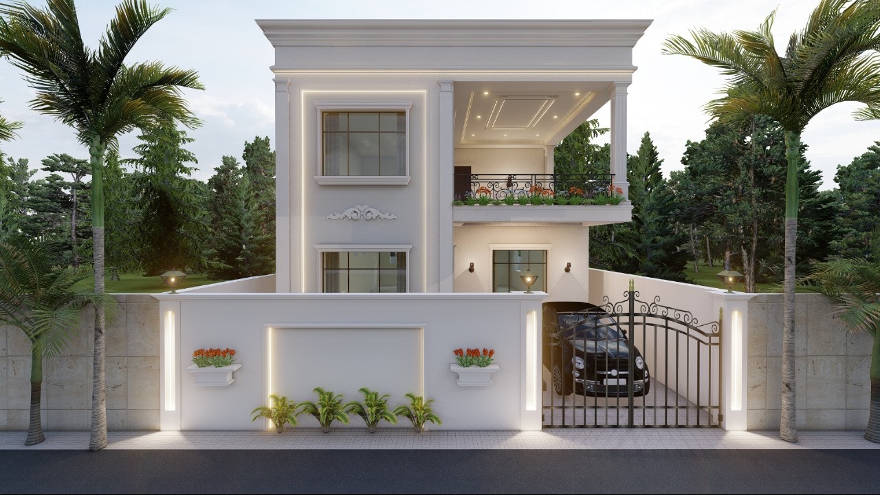 'Detailed front elevation highlighting modern architectural elements of the bungalow.' Have inquiries? call us today: 7385799294.